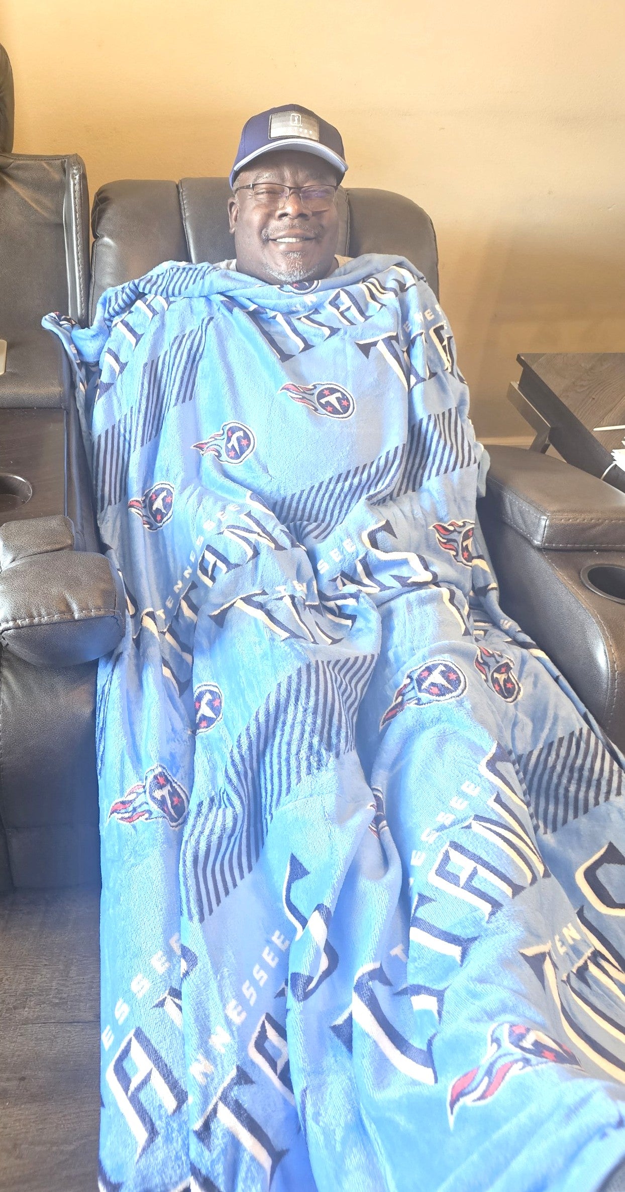 My husband loved his birthday gift All -Star Power Play . He is using the NFL blanket every day. Here is a pic. Thank you hildabeloved. UL.